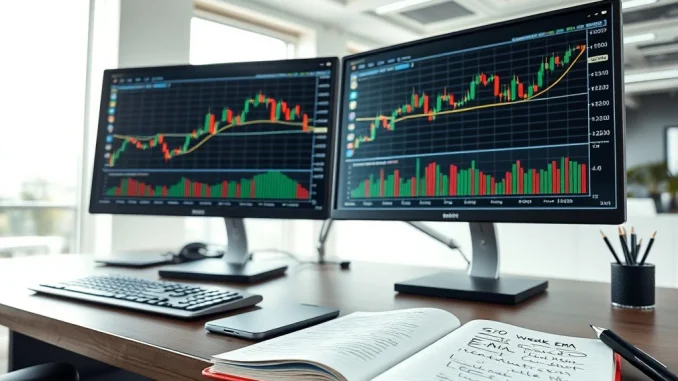 The 50-week exponential moving average represents a long-term trend indicator that smooths price data over approximately one year. Technical analysts use it to identify primary trend directions and significant support or resistance levels in cryptocurrency markets.